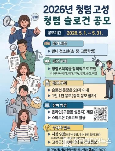 [ 한국미디어뉴스 김홍철 기자 ] 고성군은 관내 초·중·고등학생을 대상으로 「2026년 고성군 청렴 슬로건 공모전」을 오는 5월 말까지 실시한다.