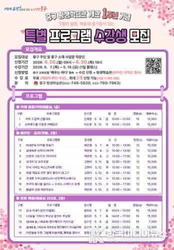 중구 관계자는 “중구 평생학습관 개관 1주년을 맞아 구민을 위한 다채로운 특강을 마련했다”라며 “앞으로도 다양한 평생교육 기회 제공과 교육 접근성 제고 등을 통해 구민 삶의 질 향상에 주력할 것”이라고 밝혔다.