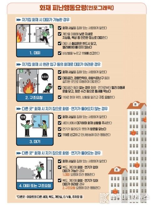 [ 한국미디어뉴스 이원영 기자 ] 소방청은 최근 아파트 화재가 잇따라 발생함에 따라, 인명피해를 최소화하기 위해 무리한 대피보다는 화재 상황을 먼저 판단하고 행동하는 상황별 피난 행동요령을 철저히 준수해 줄 것을 당부한다고 17일 밝혔다.
