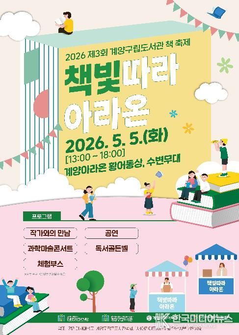 [ 한국미디어뉴스 황영수 기자 ] (재)인천광역시계양구인재양성장학교육재단 계양구립도서관은 어린이날인 5월 5일 오후 1시부터 6시까지 계양아라온 황어동상 및 수변무대 일원에서 ‘제3회 계양구립도서관 책 축제 '책빛따라 아라온'’을 개최한다고 밝혔다.