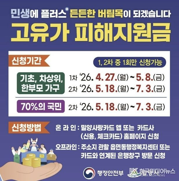 [ 한국미디어뉴스 최정화 기자 ] 경남 밀양시는 고유가로 인한 시민 부담 완화를 위해 4월 27일부터 7월 3일까지 ‘고유가 피해지원금’ 신청을 접수한다.