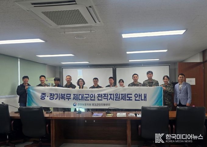 [ 한국미디어뉴스 이원영 기자 ] 국가보훈부 인천보훈지청 제대군인지원센터는 4월 22일 육군 제17보병사단 5년 이상 복무한 중장기복무 전역예정군인을 대상으로 ‘제대군인 전직지원 사업 홍보를 위한 찾아가는 군부대 순회교육’을 실시 했다. ‘찾아가는 군부대 순회교육’은 제대군인지원센터가 각 군부대와의 협조를 통해 교육 접근성과 참여율을 높이기 위해 군부대 내에서 직접 제대예정군인 전직지원제도와 국가보훈제도를 소개하는 프로그램이다.