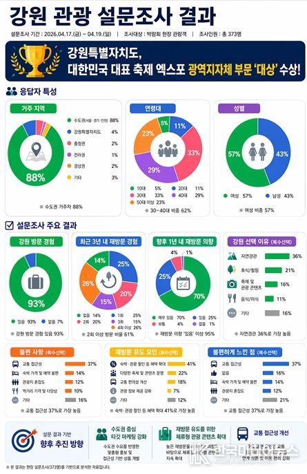 또한 관람객 대상 설문조사(총 373명)를 통해 강원 관광에 대한 인식 및 수요 특성을 분석했다.