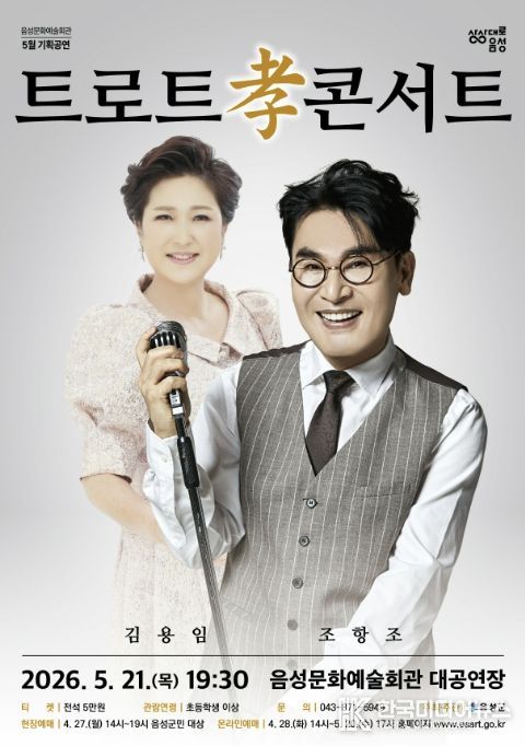 조항조는 ‘남자라는 이유로’, ‘고맙소’ 등 수많은 히트곡을 통해 호소력 짙은 감성 보이스로 심금을 울리는 감동의 무대를, 김용임은 특유의 구성진 가창력과 흥겨운 에너지로 ‘사랑의 밧줄’, ‘빙빙빙’ 등을 선보이며 음성군민들에게 최고의 트로트 무대를 선사할 것이다.