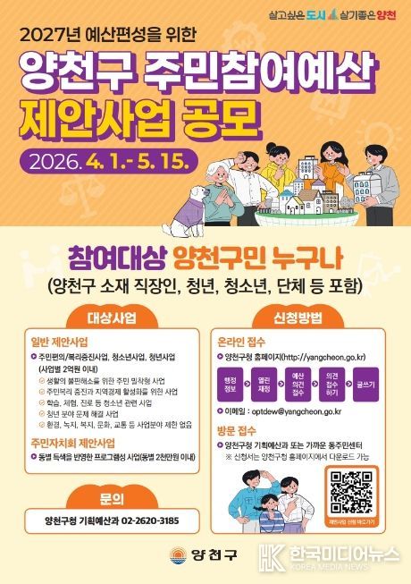 [ 한국미디어뉴스 이보영 기자 ] 양천구는 2027년 예산 편성 과정에 구민의 목소리를 반영하기 위해 ‘주민참여예산 제안사업’ 공모를 오는 5월 15일까지 진행한다고 밝혔다.