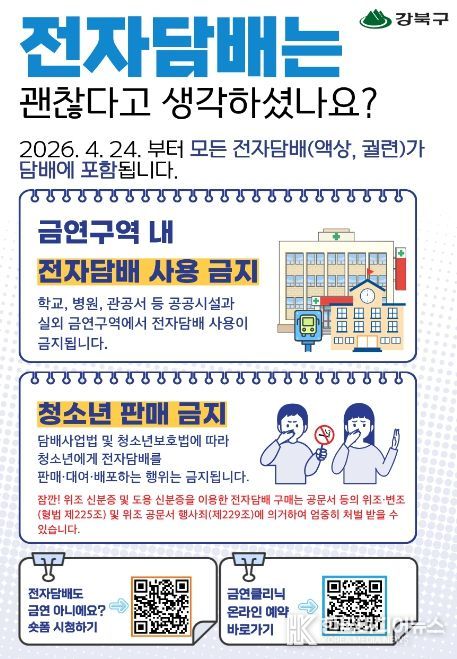 이순희 강북구청장은 “전자담배 역시 금연구역에서 사용할 수 없는 대상이라는 점을 분명히 알리고, 청소년 보호와 간접흡연 예방을 위해 법령 준수가 필요하다”며 “앞으로도 금연 환경 조성과 구민 건강 증진을 위한 정책을 지속적으로 추진하겠다”고 말했다.