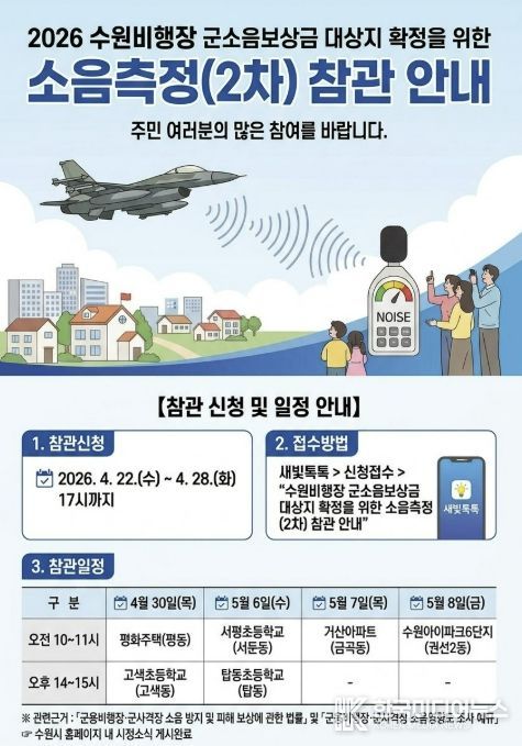 [ 한국미디어뉴스 김일규 기자 ] 수원특례시가 수원비행장 인근 주민들의 소음 피해 보상 근거가 될 국방부의 ‘수원비행장 소음 영향도 조사 2차 소음측정’ 주민 참관 참여자를 모집한다. 4월 28일까지 새빛톡톡으로 신청할 수 있다.