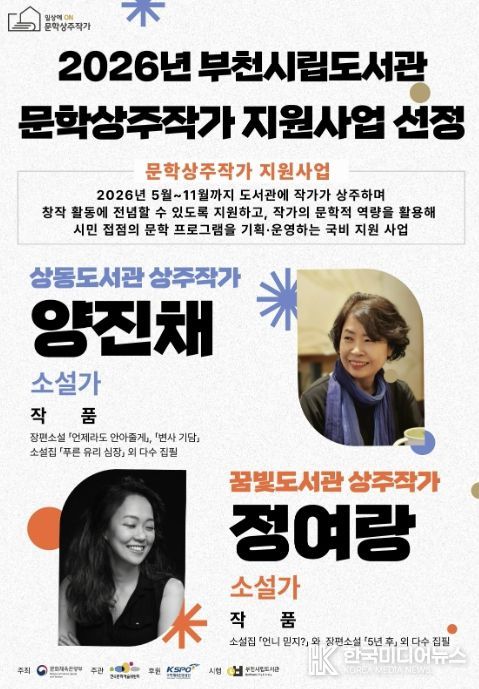 [ 한국미디어뉴스 김만길 기자 ] 부천시립상동도서관과 꿈빛도서관은 문화체육관광부가 주관하고 한국문화예술위원회가 주최하는 ‘2026년 도서관 상주작가 지원사업’ 공모에 선정돼 5월부터 시민 대상 문학 프로그램을 운영한다.