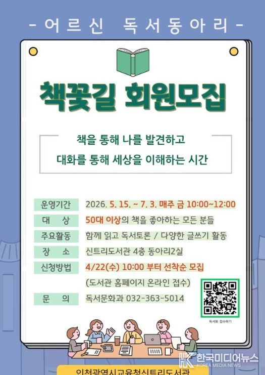[ 한국미디어뉴스 이원영 기자 ] 인천광역시교육청신트리도서관은 어르신의 정서 안정과 삶의 질 향상을 지원하고 지역사회 독서문화 활성화를 위해 독서동아리 ‘책꽃길’을 운영한다.