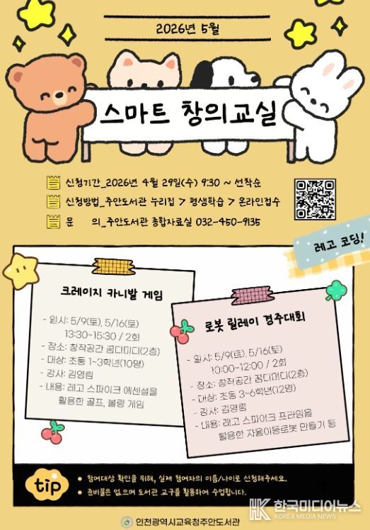 [ 한국미디어뉴스 이원영 기자 ] 인천광역시교육청주안도서관은 4월 29일부터 관내 초등학생을 대상으로 ‘5월 스마트창의교실’ 참여자를 모집한다.