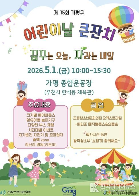 [ 한국미디어뉴스 김서안 기자 ] 가평군은 오는 5월 1일 오전 10시 가평종합운동장에서 ‘제15회 가평군 어린이날 기념행사’를 개최한다. 가평군어린이집연합회와 가평군육아종합지원센터가 공동 주관하는 이번 축제는 기념행사와 공연, 놀이, 체험 부스 등 다채로운 프로그램으로 꾸며진다.