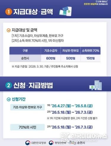 [ 한국미디어뉴스 이종철 기자 ] 순천시는 중동발 고유가로 인한 시민 부담 완화와 지역 경제를 살리기 위해 자체적으로 지급 중인 ‘순천시 민생회복지원금’에 이어, 오는 27일부터 정부 정책에 따른 1차 ‘고유가 피해지원금’을 지급한다.