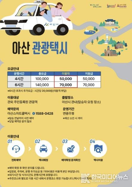 [ 한국미디어뉴스 이원영 기자 ] 아산시는 소규모 관광객의 이동 편의를 높이기 위해 오는 4월 27일부터 ‘아산 관광택시’를 운영한다고 밝혔다.