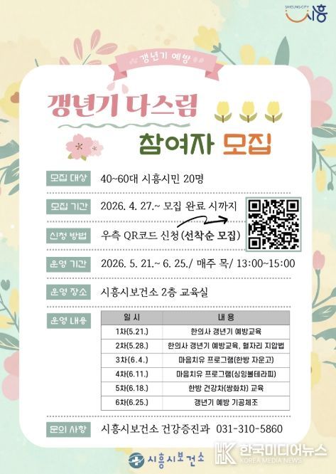 프로그램은 오는 5월 21일부터 6월 25일까지 매주 목요일 오후 1시부터 3시까지 총 6회에 걸쳐 시흥시보건소 교육실에서 운영된다. 주요 내용은 한의약 기반 갱년기 예방교육을 비롯해 혈자리 지압법, 마음치유 프로그램, 기공체조, 한방차 만들기 등으로 구성됐다.