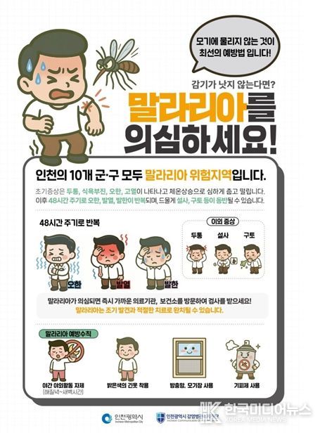 [ 한국미디어뉴스 이원영 기자 ] 인천광역시는 오는 4월 25일 ‘세계 말라리아의 날’을 맞아 본격적인 모기 활동 시기에 대비해 시민들에게 국내 말라리아 감염 예방과 조기 검사의 중요성을 당부했다.
