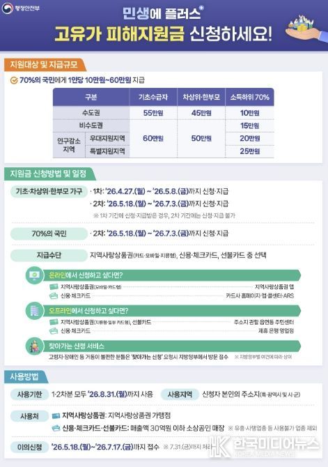 민생안정지원금 2차는 4월 27일부터 5월 22일까지, 고유가 피해지원금 1차는 4월 27일부터 5월 8일까지 각각 신청·접수할 예정이며, 군은 군민들이 신청 기간을 놓치지 않도록 지속적인 홍보와 안내를 이어갈 계획이다.