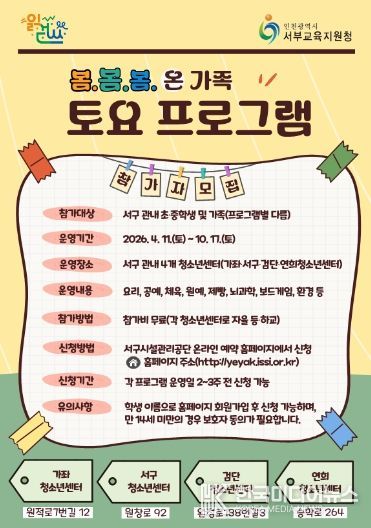 [ 한국미디어뉴스 이원영 기자 ] 인천서부교육지원청은 4월 11일부터 10월 17일까지 ‘2026 서부 방과후·돌봄 지역연계(봄봄봄) 온 가족 토요 프로그램’을 운영한다.