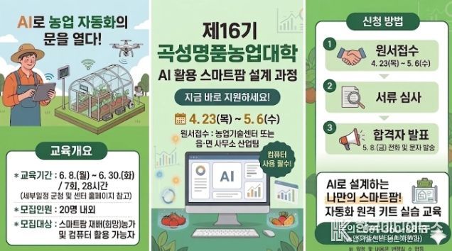 곡성군농업기술센터 관계자는 “이번 교육은 고비용 스마트팜의 장벽을 낮추고, 농업인이 AI를 활용하여 스스로 농장을 설계하는 혁신적인 실습 과정이 될 것”이라며, “디지털 농업으로의 도약을 꿈꾸는 열정 있는 농업인들의 많은 관심과 참여를 바란다”라고 전했다.