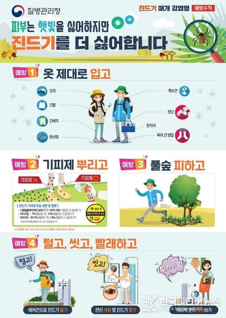 이에 보건소는 ▲야외활동 시 긴팔·긴바지 착용 등 피부 노출 최소화 ▲진드기 기피제 사용 ▲풀밭 접촉 최소화 ▲야생동물과의 접촉 자제 ▲귀가 후 즉시 샤워 및 의복 세탁 ▲진드기 부착 여부 확인 등 예방수칙을 철저히 준수할 것을 당부했다.