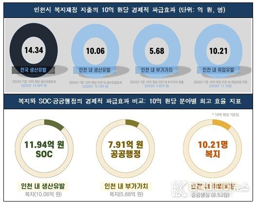 분석결과에 따르면, 2024년 기준 인천시 복지재정은 약 8.2조 원의 생산유발효과, 4.3조 원의 부가가치, 7만 1천 명의 취업유발효과를 창출한 것으로 나타났다.