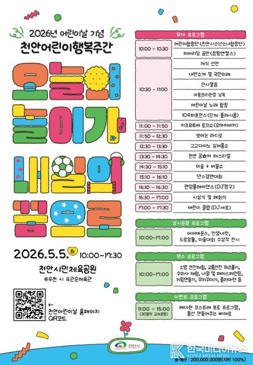 [ 한국미디어뉴스 이원영 기자 ] 천안시는 제104회 어린이날을 맞아 5월 1일부터 5일까지 ‘2026 천안어린이 행복주간’을 운영한다고 28일 밝혔다.