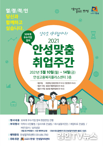 [ 경인TV뉴스 김선근 기자 ]경기 안성시(시장 김보라)는 이달 10∼14일까지 5일간 안성고용복지플러스센터에서 '2021 안성맞춤 취업주간'을 개최한다고 밝혔다.