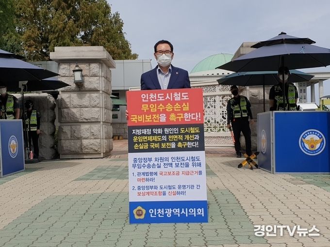 [ 경인TV뉴스 김선근 기자 ] 인천광역시의회 이용범(계양구 제3선거구) 의원이 6일 지하철 무임승차 손실에 대해 정부 부담 검토를 요구하며 국회 1인 시위에 나섰다.