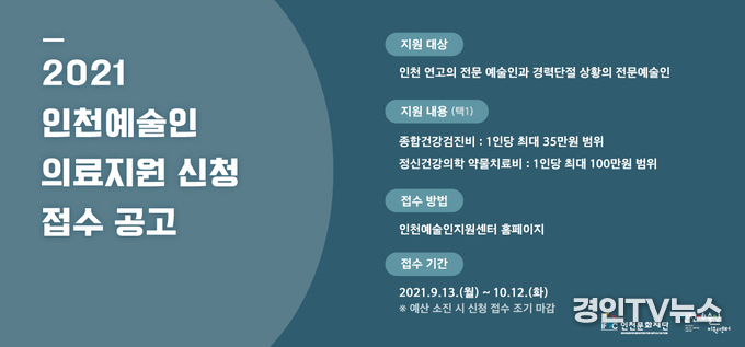 [ 경인TV뉴스 김선근 기자 ] (재)인천문화재단(이하 재단)은 인천 지역 전문예술인을 위한 종합건강검진, 정신건강의학 약물치료 비용을 지원하는 ‘2021 인천 예술인 의료지원’을 시작한다.