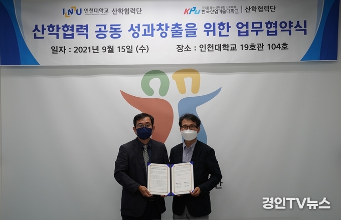 [ 경인TV뉴스 김선근 기자 ] 「인천대학교 산학협력단(단장 김규원)」과「한국산업기술대학교 산학협력단 (단장 안동희)」은 4차 산업혁명 시대를 맞이하여 지역산업계의 혁신 수요에 능동적으로 대응 할 수 있는 미래 혁신인재 양성과 지역산업체의 고부가가치 창출을 지원하기 위해 2021. 09. 15(수) 인천대학교 19호관에서 업무협약을 체결하였다.