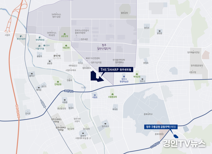 교통 환경도 좋다. 단지 바로 앞에 SK 하이닉스, LG전자 등이 입주해 있는 청주일반산업단지가 있어 직주근접 (직장과 주거가 가까운 것) 프리미엄을 누릴 수 있고 제2순환로, 36번 국도와 서청주IC, 남이IC 및 청주고속터미널과 시외버스터미널이 가까워 시내·외 접근도 용이 하다.
