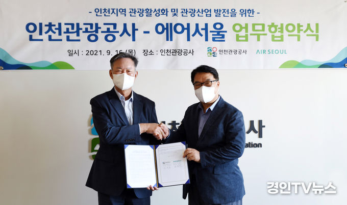 [ 경인TV뉴스 김선근 기자 ] 인천관광공사(사장 민민홍, 이하 공사)와 에어서울(주)(대표 조진만, 이하 에어서울)은 16일 인천지역 관광 활성화 및 관광산업 발전을 위한 업무협약을 체결했다.