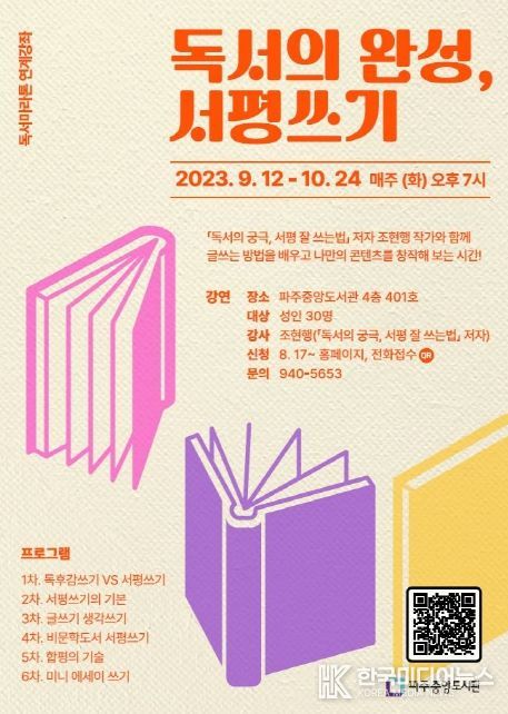 [ 한국미디어뉴스 윤영태 기자 ] 파주시 중앙도서관은 9월 12일부터 10월 24일까지 성인을 대상으로 하는 '독서의 완성, 서평 쓰기' 강좌를 운영한다.