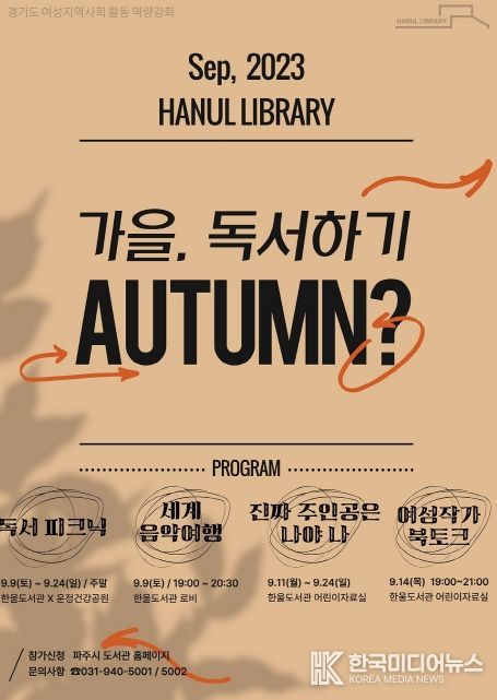[ 한국미디어뉴스 윤영태 기자 ] 파주 한울도서관은 '독서문화진흥법'에서 정한 9월 독서의 달을 맞아 시민의 독서 의욕 고취 등 독서문화 진흥을 위해 다양한 프로그램을 준비했다.