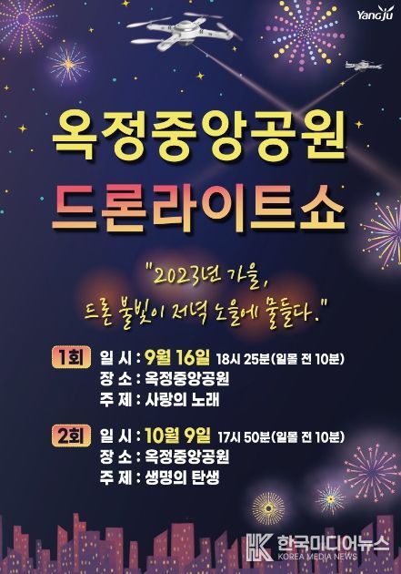 시는 오는 16일 오후 6시 25분과 10월 9일 오후 5시 50분에 옥정중앙공원 잔디마당에서 드론라이트쇼를 진행한다고 밝혔다.