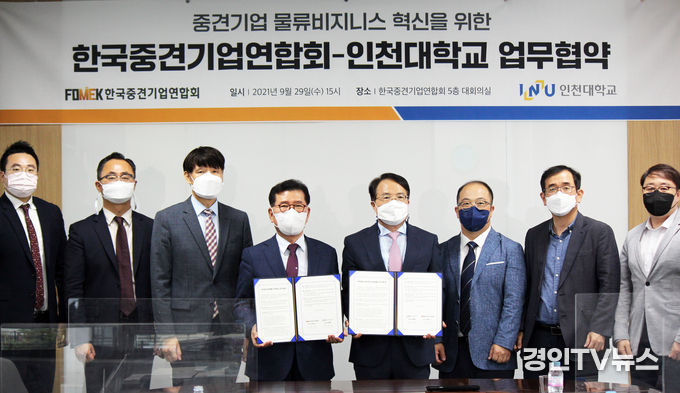 [ 경인TV뉴스 김선근 기자 ] 인천대학교(총장 박종태)는 지난 9월 29일 한국중견기업연합회(회장 강호갑)과 국내 중견기업 물류비지니스 혁신을 위해 최근 업무협약을 체결했다고 1일 밝혔다.
