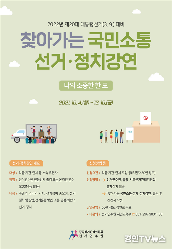 [ 경인TV뉴스 김선근 기자 ] 중앙선거관리위원회 선거연수원은 2022년 제20대 대통령선거를 앞두고 10월 4일부터「찾아가는 국민소통 선거·정치강연」을 운영한다고 밝혔다.