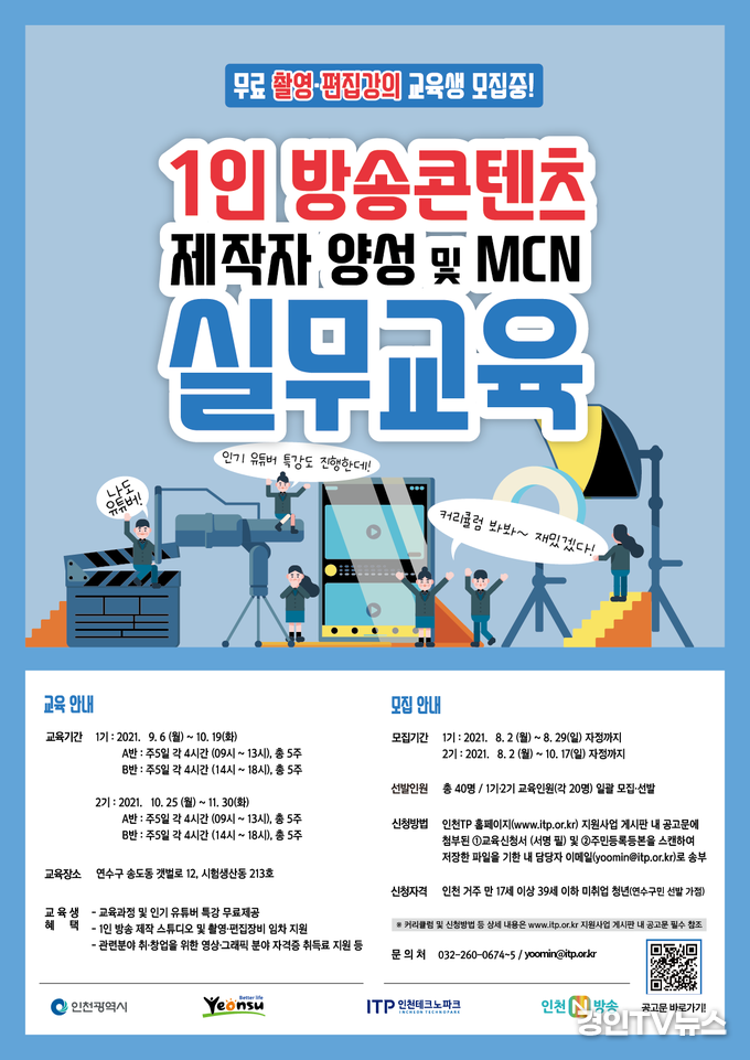 인천테크노파크(인천TP)는 1인 방송 제작자 양성 및 관련 분야 일자리 창출을 위한 ‘1인 방송콘텐츠 제작자 양성 및 MCN(다중 채널 네트워크) 실무교육’ 수강생을 모집한다고 12일 밝혔다.