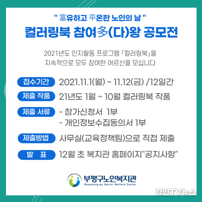 [ 경인TV뉴스 김선근 기자 ] 인천 부평구노인복지관(관장:최민수)은 10월 노인의 날 및 경로의 달을 맞아 인지활동 프로그램에 적극 참여한 어르신을 대상으로 심리방역 ‘컬러링북 참여多왕 공모전’을 오는 27일까지 진행한다고 13일 밝혔다.