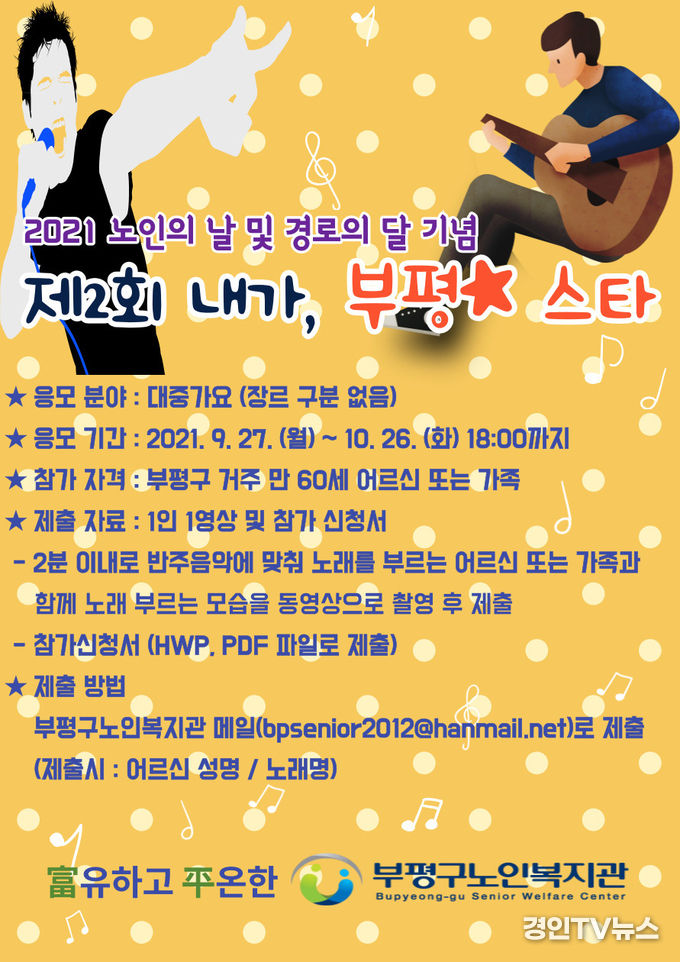 [ 경인TV뉴스 김선근 기자 ] 인천 부평구노인복지관(관장: 최민수)은 복지관 운영재개 및 노인의 날과 경로의 달을 기념하여, 제2회 ‘내가, 부평☆스타’ 노래자랑 공모전을 비대면 온라인 대회로 개최한다고 밝혔다.