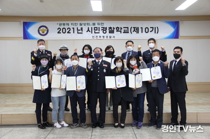 [ 경인TV뉴스 김선근 기자 ] 인천부평경찰서(서장 이동원)는 지난 10월 29일 시민경찰학교(10기) 수료식을 개최하였다. 시민경찰학교는 코로나 백신 2차 접종 완료 조건을 바탕으로 10일간의 모집을 통해 적극적인 활동이 기대되는 시민들로 선발되었다.