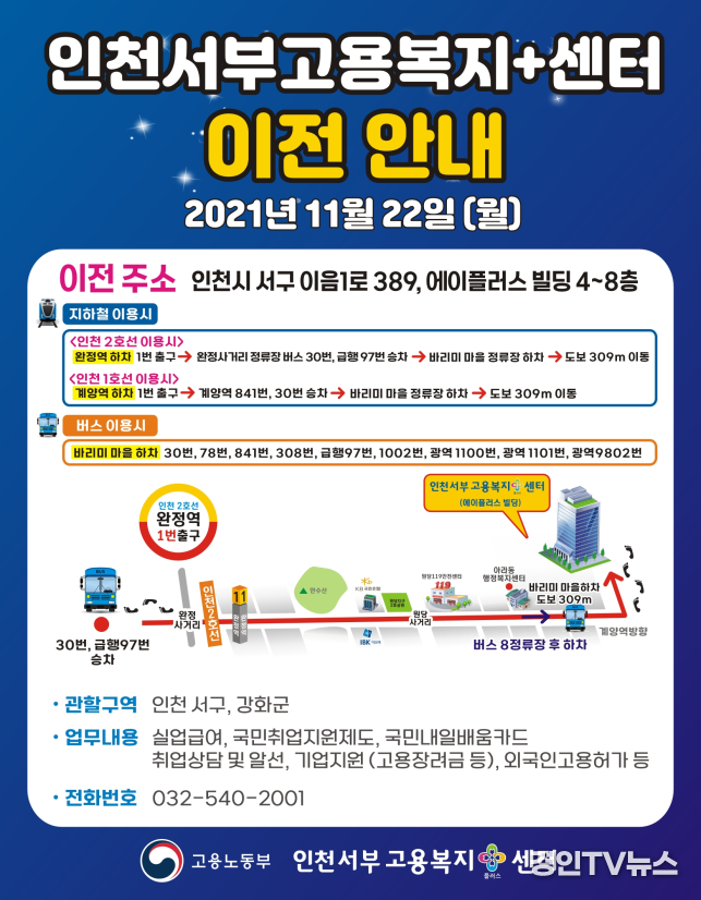 인TV뉴스 관리자 기자 ] 인천서부고용복지+센터가 오는 2021. 11. 22(월) 인천 서구 검단신도시(인천 서구 이음1로 389, 에이플러스 빌딩 4~8층)로 확장 이전한다.