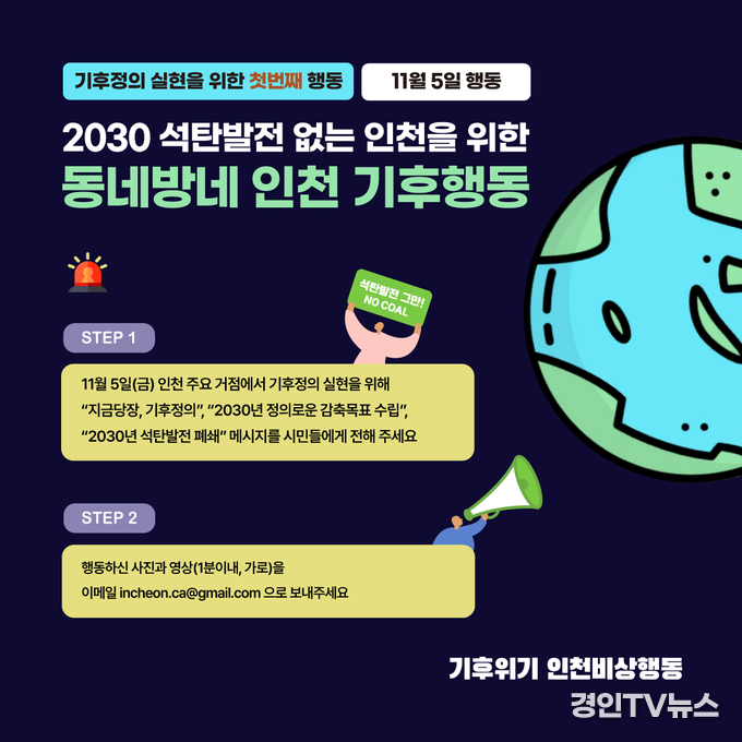 기후위기 인천비상행동은 기후정의를 위한 세계 기후정의 행동의 날을 맞아 11월 5일(금)과 6일(토) 이틀간 시민들의 2030 석탄발전 조기폐쇄의 희망과 염원을 대외적으로 홍보하고자 합니다. (11월 6일 걷기대회 신청 : https://bit.ly/걷기대회신청 )