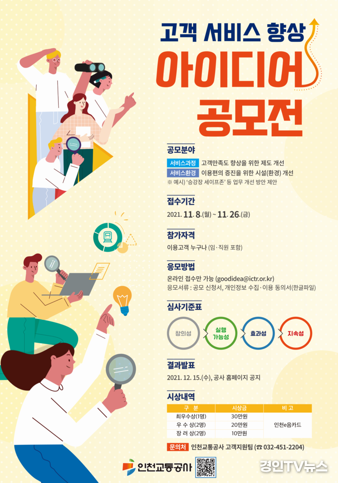 [ 경인TV뉴스 김선근 기자 ] 인천교통공사(사장 정희윤)는 고객서비스제도 및 이용 편의시설 개선으로 서비스 품질향상, 고객가치실현 등 CS 경영혁신을 통한 고객만족경영을 실현하기 위해 이용 고객들을 대상으로 ‘고객서비스 향상 아이디어 공모전’을 8일부터 개최한다고 밝혔다.