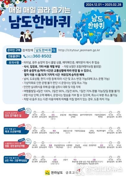 [ 한국미디어뉴스 기자 ] 전라남도 관광지 순환버스 남도한바퀴가 전남의 겨울을 즐길 다양한 테마상품을 준비, 관광객을 맞이한다.