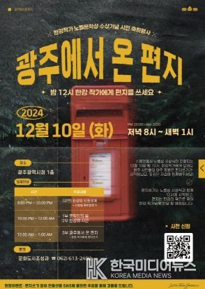 광주시는 스웨덴에서 진행되는 노벨상 시상식 일정에 맞춰 10일 밤 8시부터 다음날 새벽 1시까지 광주시청 시민홀에서 ‘광주에서 온 편지’를 주제로 ‘한강 작가 노벨문학상 수상기념 시민 축하행사’를 개최한다. 신교수 특강과 함께 재즈·샌드아트 등 다채로운 공연, 시민 500여명이 마음을 모으는 한강 작가에 축하편지 쓰기, AI로 복원된 ‘소년이 온다’의 ‘동호’의 축하인사 등 특별한 감동을 선사할 예정이다.