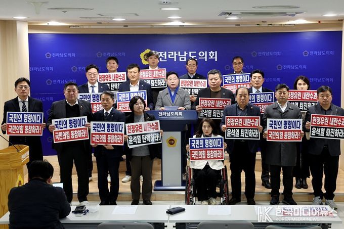 전남도의회는 9일 기자회견을 통해 “불법 계엄령 선포와 국회 기능 무력화 행위에 대한 철저한 수사와 책임자 처벌을 촉구하며, 국민의 기본권과 주권을 침탈하고 국민을 위협하는 윤석열은 즉각 물러나야 한다”고 주장했다.