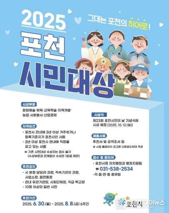 [ 한국미디어뉴스 김서안 기자 ] 포천시는 7월 28일부터 8월 18일까지 ‘2025년 제3회 포천시 청년대상’ 후보자를 추천받는다.