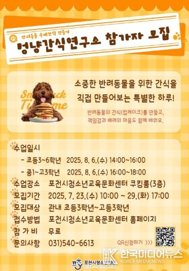 [ 한국미디어뉴스 김서안 기자 ] 포천시청소년재단 포천시청소년교육문화센터는 오는 8월 6일 여름방학을 맞이해 관내 청소년을 대상으로 반려동물 수제 간식 만들기 일일 수업 '멍냥간식연구소'를 운영한다.