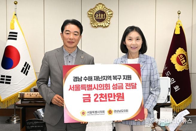 [ 한국미디어뉴스 이원영 기자 ] 서울특별시의회 최호정 의장은 7월 24일 경남도의회를 찾아, 폭우로 큰 피해를 입은 산청·합천 등의 조속한 복구를 돕기 위해 서울시의원들의 뜻을 모아 마련한 2천만 원의 성금을 최학범 경남도의회의장과 박희순 대한적십자사 경남지사 회장에게 전달했다.