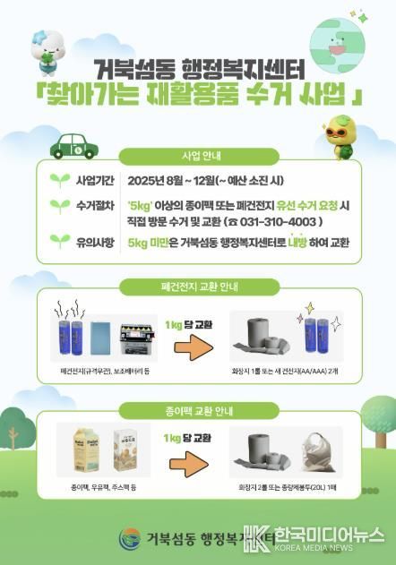 사업은 거북섬동 관내 카페, 학교, 공공기관 등 재활용품이 많이 발생하는 장소를 중심으로 운영되며, 종이팩 또는 폐건전지를 5kg 이상 모아 수거를 요청하면 일정에 맞춰 현장 방문이 이뤄진다. 교환 기준은 폐건전지 1kg당 화장지 1롤 또는 새 건전지(AA 또는 AAA) 2개다. 수거 신청 및 문의는 거북섬동 행정복지센터로 하면 된다.